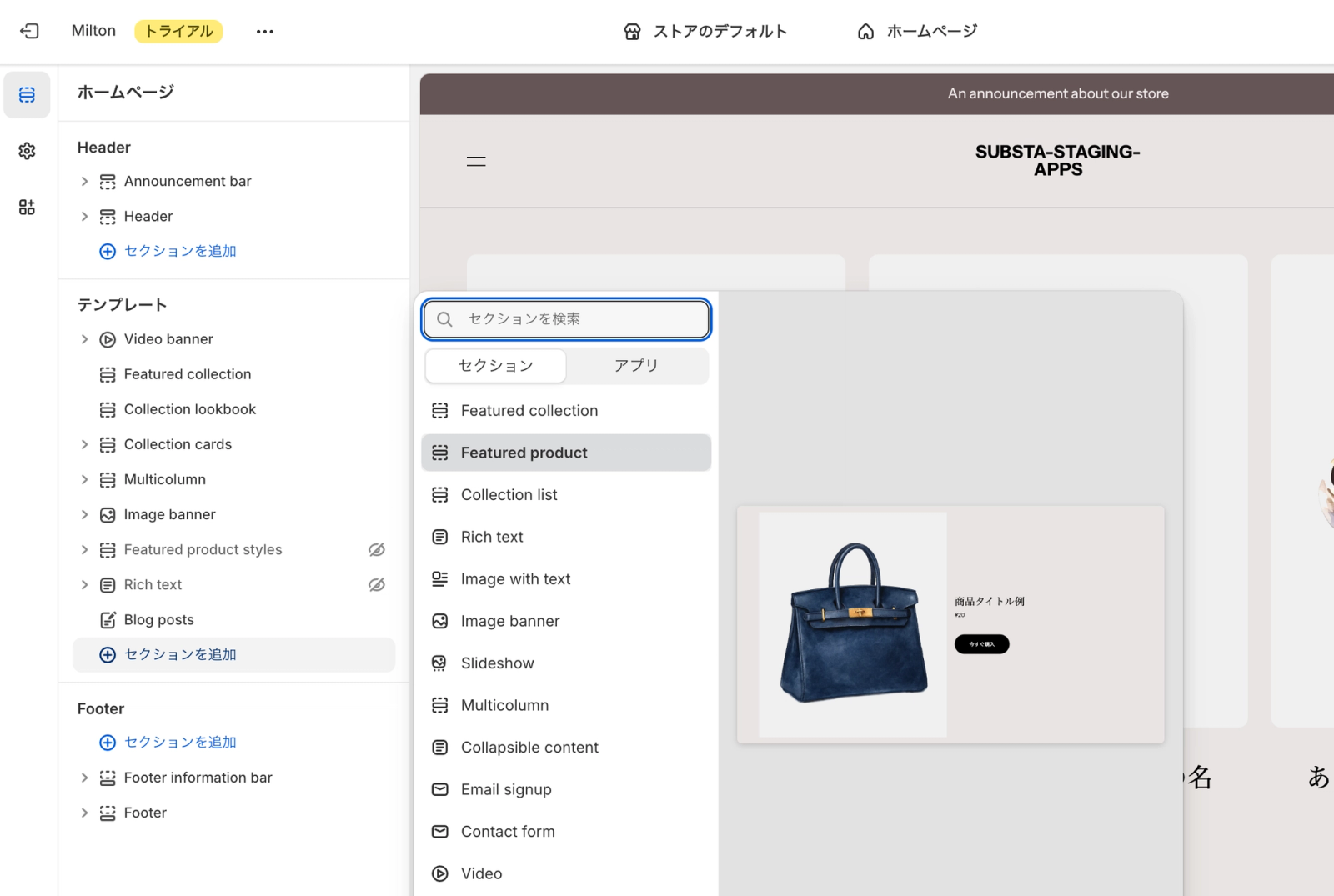 Shopifyは開発環境を作ればテーマデモをインストールできます。デモを入れると次が確認できるので実現したい構成に対応できるか確認してみてください。